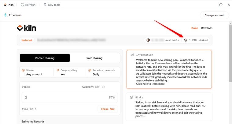 با استفاده از استخرهای استیک، اتر استیک شده در حساب اتریوم لجر لایو شما نمایش داده نمیشود اما میتوانید آن را در اپلیکیشن Kiln مشاهده کنید.
