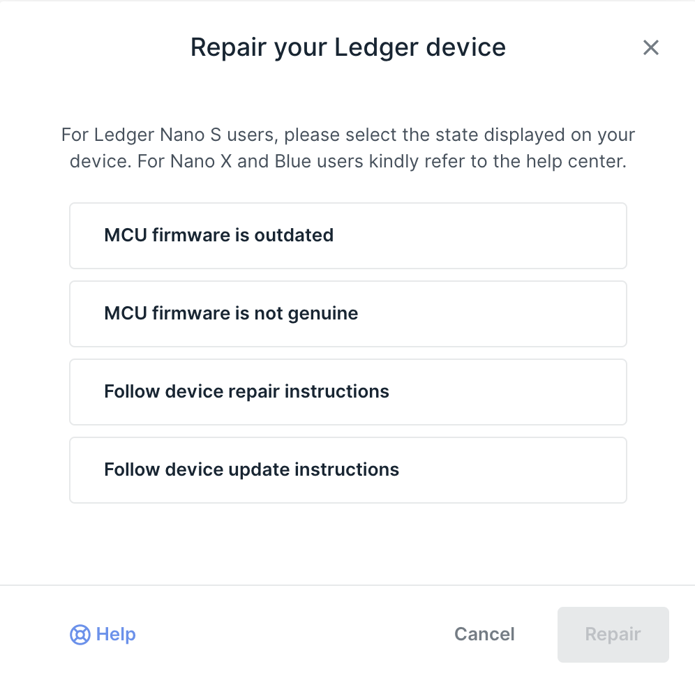 - برای دسترسی به ابزار تعمیر دستگاه، وارد لجر لایو شده و صبر کنید تا دکمه آبی رنگ Repair نمایان شود یا میتوانید به روش مستقیم با طی کردن مسیر Settings > Help > Repair your Ledger device به آن دسترسی پیدا کنید.